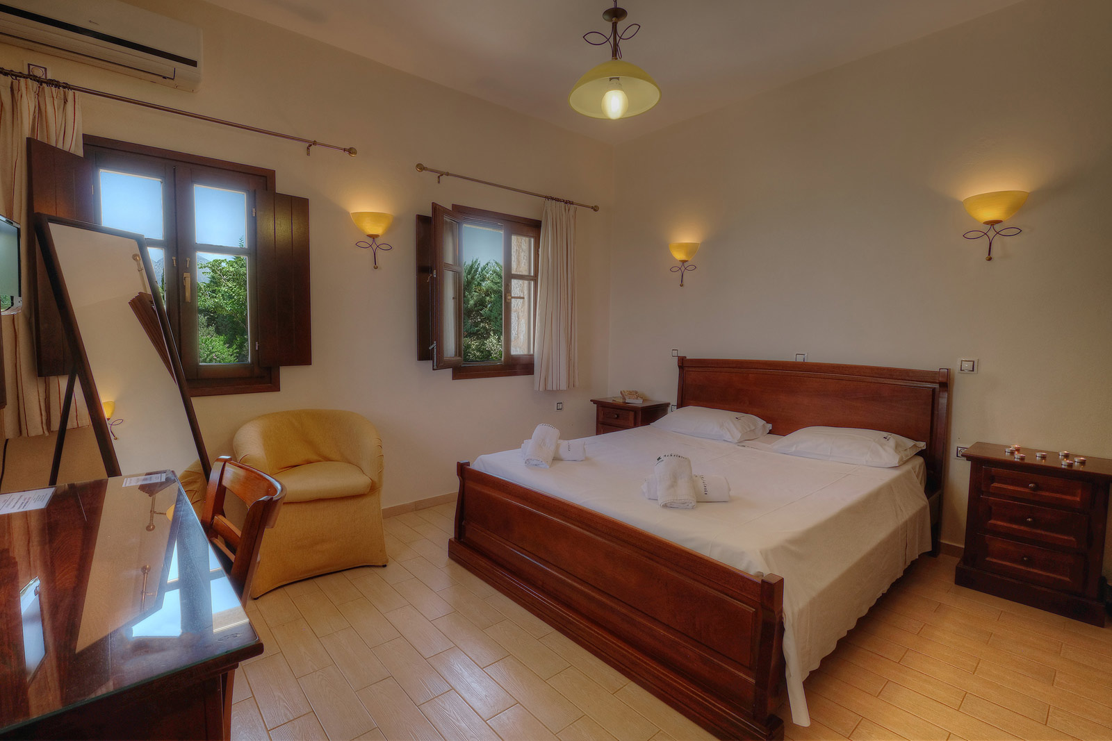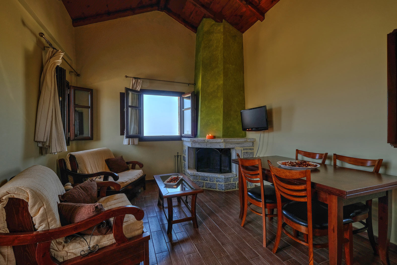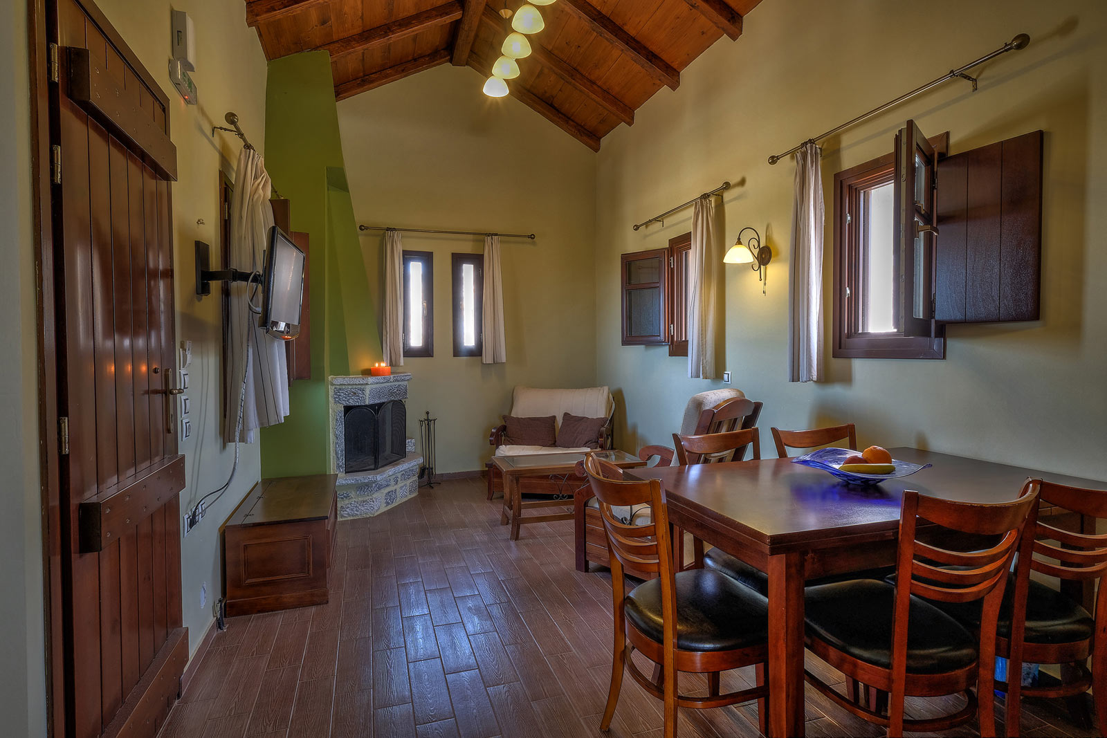 Η ορατή ψηλοτάβανη ξύλινη οροφή δίνει το δικό της χαρακτήρα στο συγκεκριμένο τύπο δωματίου, ενώ τα κλασικά έπιπλα, αλλά και το τζάκι, συνάδουν με το γενικό στυλ του καταλύματος. Ο ποιοτικός εξοπλισμός της κουζίνας και του μπάνιου εξασφαλίζουν άνετη διαμονή.