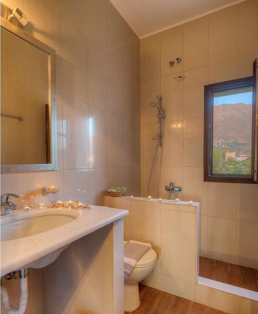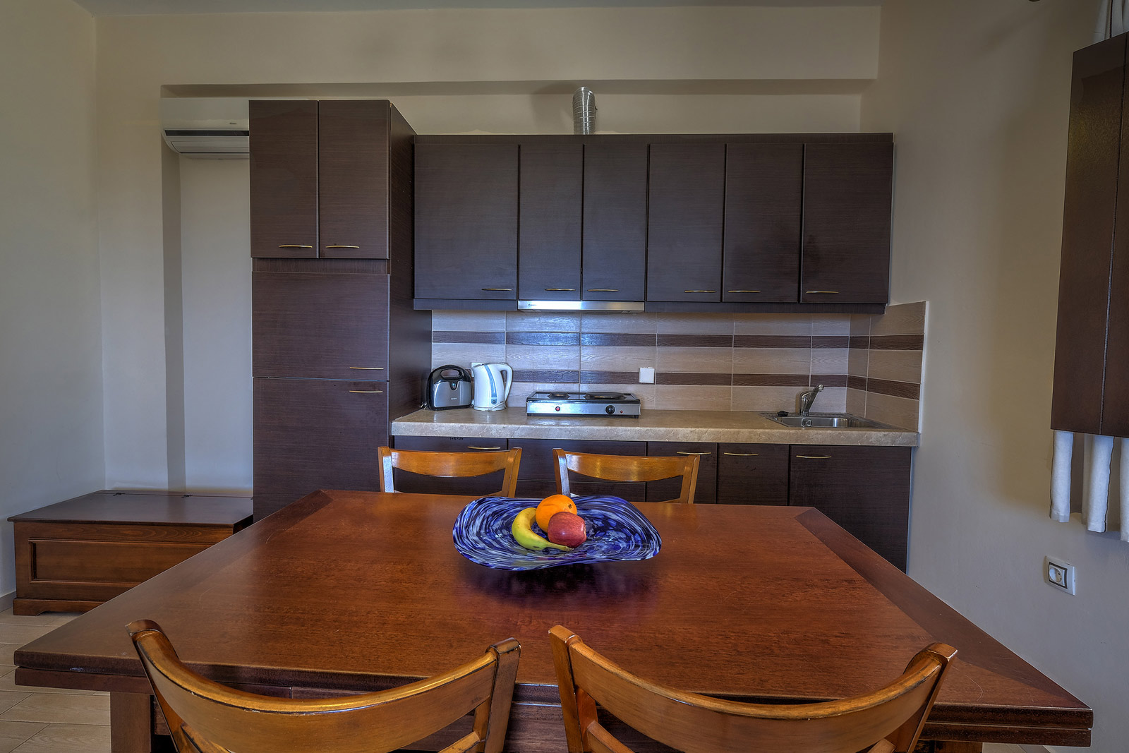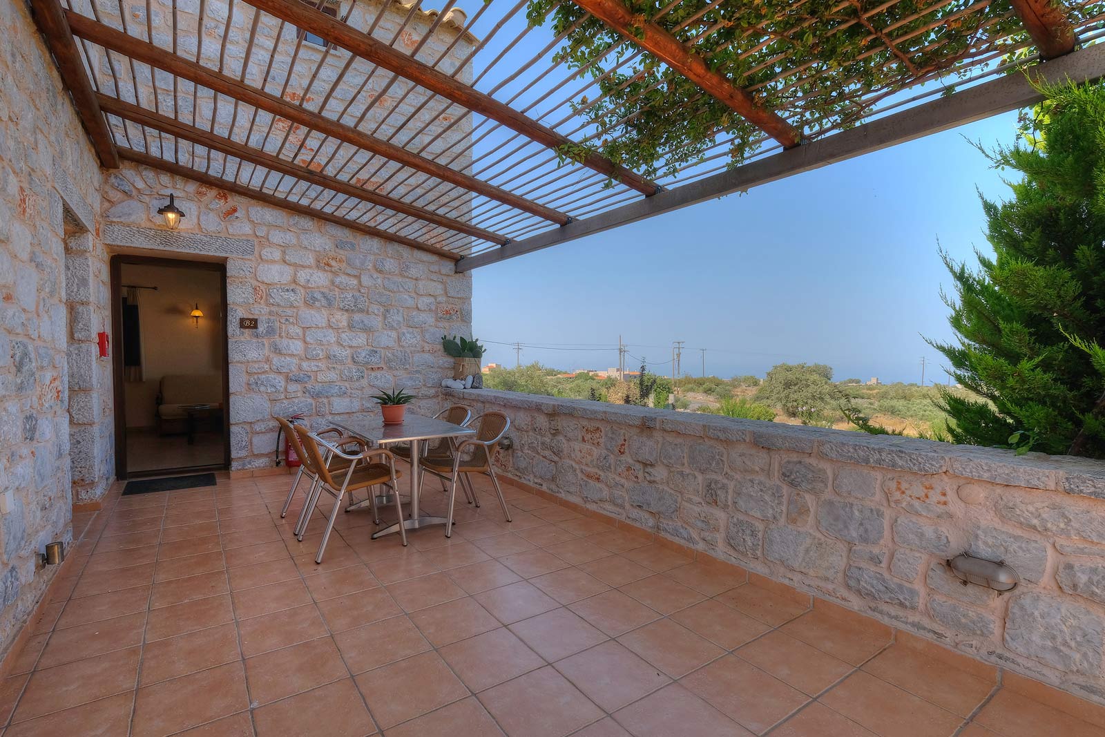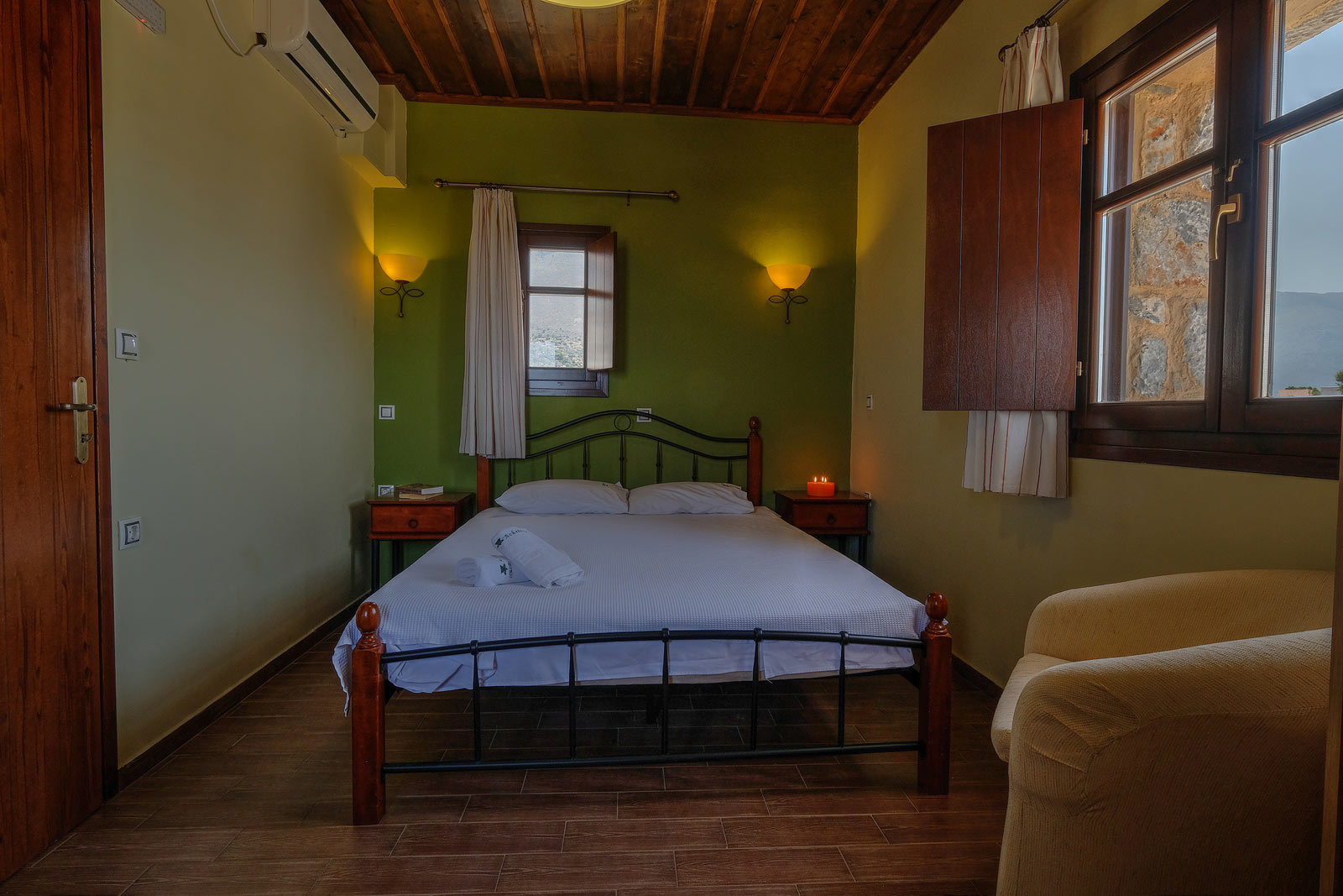 Η ορατή ψηλοτάβανη ξύλινη οροφή δίνει το δικό της χαρακτήρα στο συγκεκριμένο τύπο δωματίου, ενώ τα κλασικά έπιπλα, αλλά και το τζάκι, συνάδουν με το γενικό στυλ του καταλύματος. Ο ποιοτικός εξοπλισμός της κουζίνας και του μπάνιου εξασφαλίζουν άνετη διαμονή.